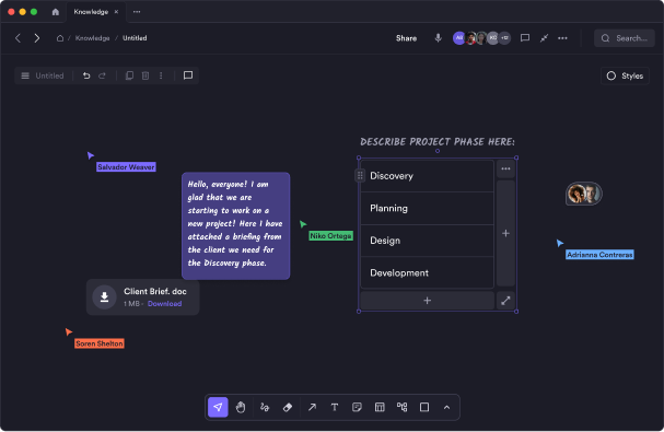 Some conversations move faster when everyone can see the map. Open an infinite canvas to sketch a quarterly roadmap, draw handoffs, or lay out a hiring plan. Add swimlanes by stream, drop cards for milestones, and link each card back to its page. Use it live during a planning hour, then let people add notes asynchronously. Because the canvas sits inside your space, it stays part of the working system instead of getting lost in a slide deck.