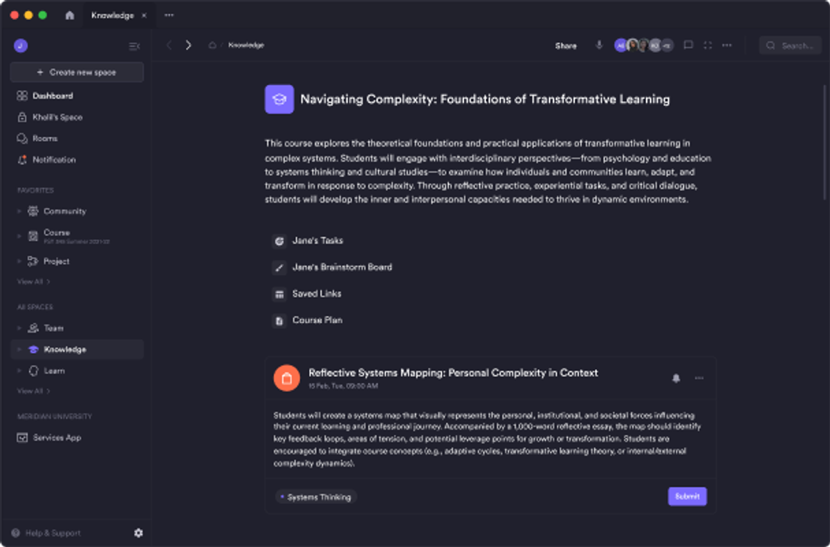 Because pages, rooms, assignments, and analytics share a single space, the week holds together. The page anchors content. The assignment sets expectations. The post captures dialogue. The video catches tone. The analytics point to what needs reinforcement. Nothing drifts.